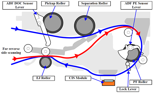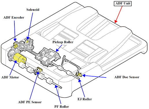 The ADF mechanism of this product uses a stationary image sensor that scans documents transported by the mechanism. It consists of ADF motor, ADF Encoder, ADF PE Sensor, ADF Doc Sensor, PF Roller, EJ Roller, Pickup Roller and etc.