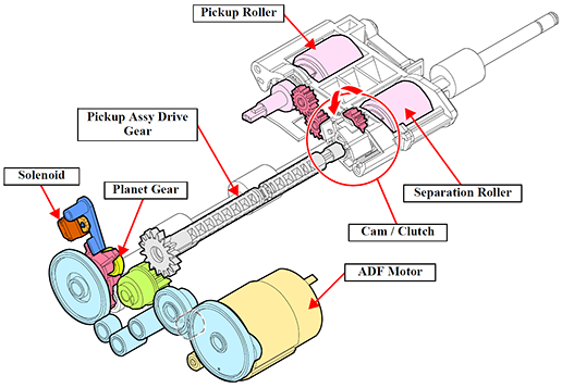 To prevent the next document from being fed while the previous document is being reversed inside the ADF, the drive of the Pickup Assy drive gear is shut off by the Planet Gear and Solenoid so that the Pickup Assy does not move until the reverse operation is finished.