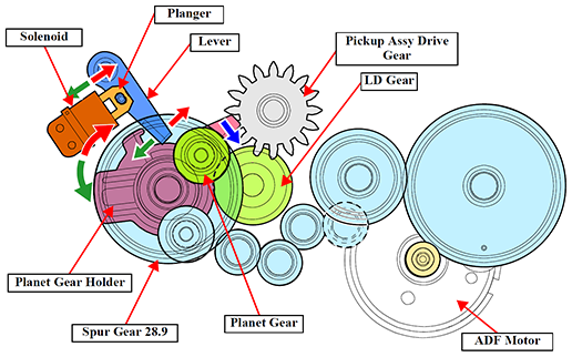 The drive from the ADF Motor is conveyed through the Spur Gear 28.9 to the connected Planet Gear Holder, and the Planet Gear Holder rotates clockwise.
