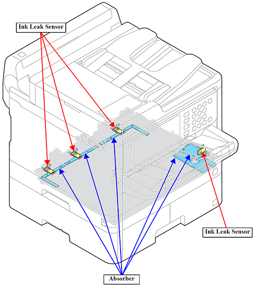 Ink Leak Sensors are provided inside the Ink Pack Unit, and detect an ink leak by the adherence of ink on it (Porous Pad Cap Lower) when an ink leak occurs. It also generates an ink leak error in the printer.