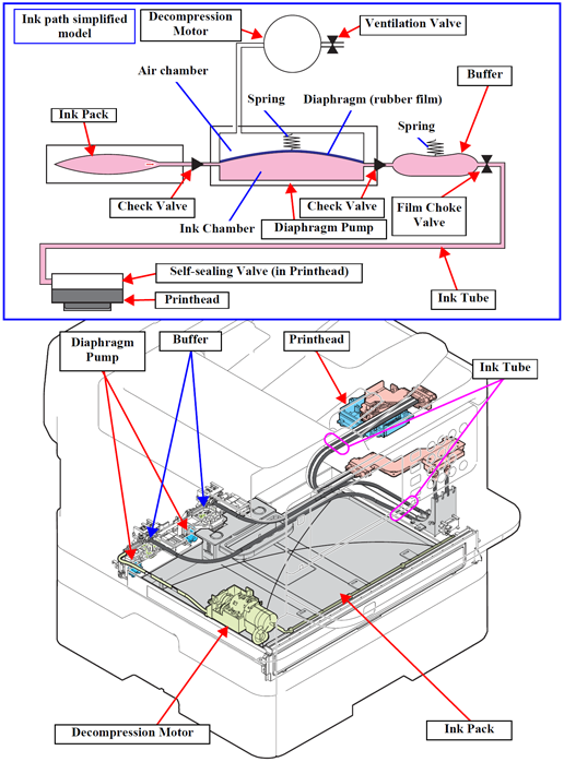 The diaphragm is operated when the Decompress Pump Unit reduces the pressure inside the Diaphragm Pump, and it sucks ink from the ink packs. Ink is supplied through the Buffer and ink tube to the Print Head.