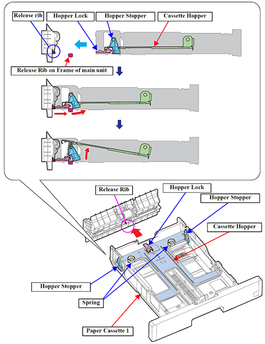 When you set the Paper Cassette in the printer, the Hopper Lock and Hopper Stopper of the Paper Cassette come in contact with the Release Rib, and the lock is released.