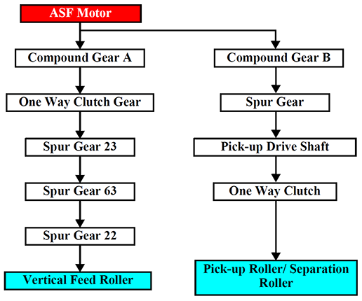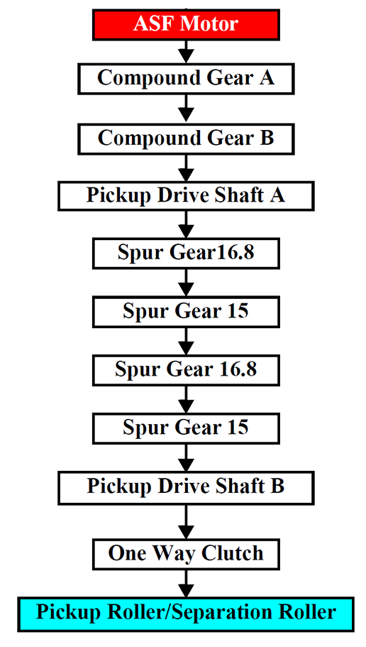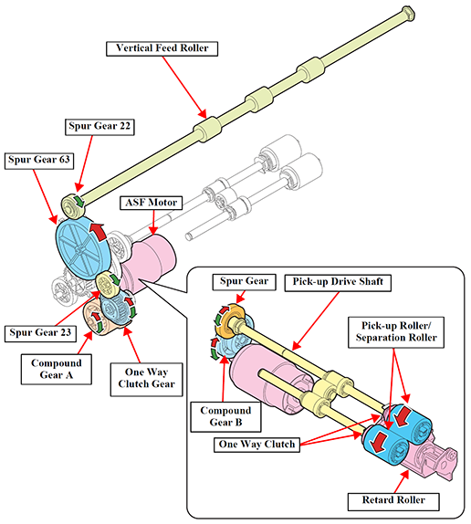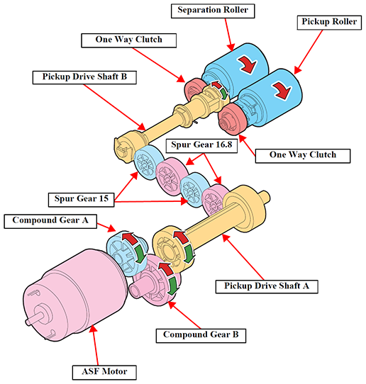 The pickup roller and separation roller uses a oneway clutch to always rotate in a set direction (paper feed direction) only. When the ASF Motor rotates the opposite direction of paper feeding, the drive force is cut off by the One Way Clutch, so neither the Pick-up Roller nor Separation Roller rotates.