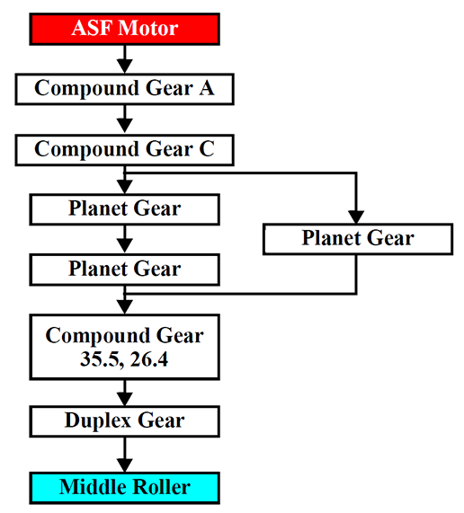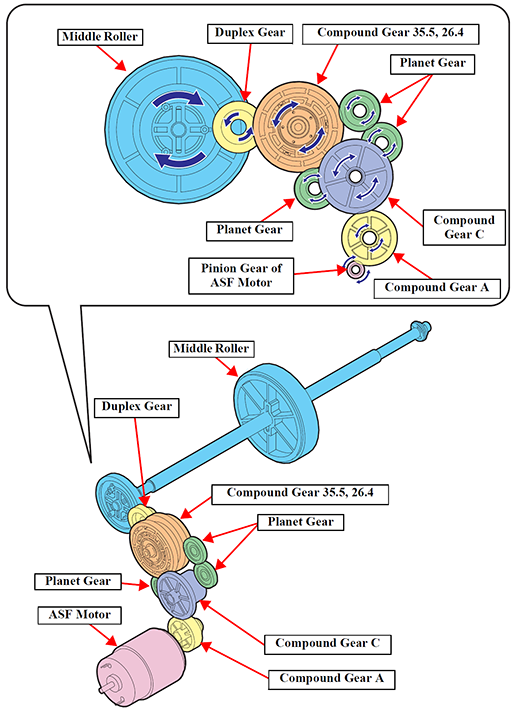 The Middle Roller always rotates in a set direction (paper feed direction) because of the Planet Gear, regardless of the ASF motor rotational direction.