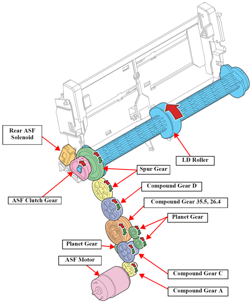 Since the ASF Motor drives the pick-up mechanism and intermediate feeding mechanism, the ASF Clutch Gear and Rear ASF Solenoid Assy turn the drive force ON/OFF so that the LD Roller rotates during the rear feed only.