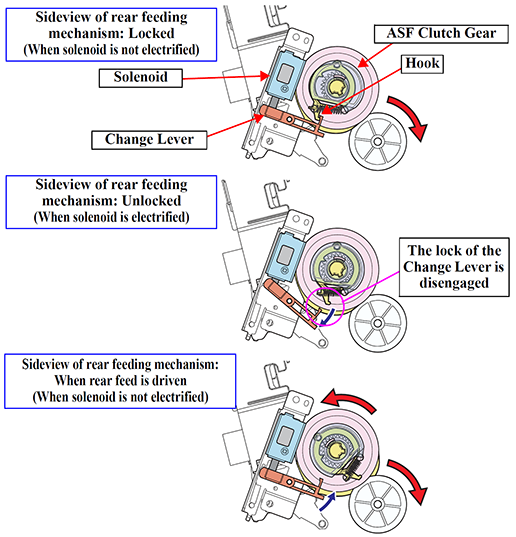 When the printer starts performing the rear feed, the Solenoid of the Rear ASF Solenoid Assy is electrified and the Change Lever is moved down to unlock the hook.