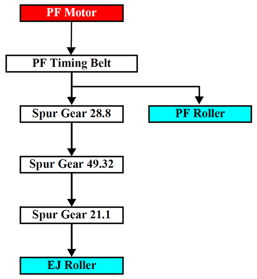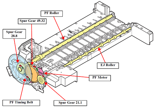 The paper feed mechanism is driven by the PF Motor's drive force. The drive force of the PF Motor is transmitted by the PF Timing Belt to the PF Roller and EJ roller to perform paper feeding before/after printing.