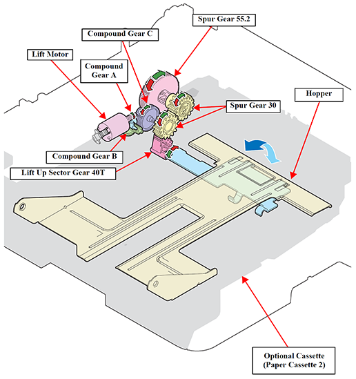 - The drive of the Lift Motor is transferred to the optional hopper-up mechanism parts, which lifts up the Optional Cassette Hopper, and the paper set in Paper Cassette 2 comes in contact with the Optional Pickup Roller.