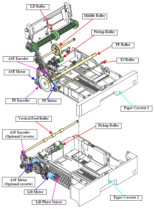 | Drives the Pickup Roller, loading paper from the Standard Cassette. Paper loaded from the Cassette is fed to the PF Roller using the Middle roller of the Rear unit. |