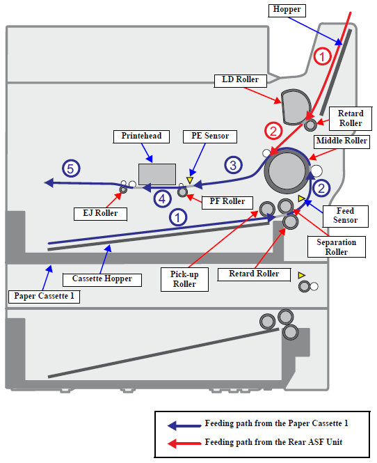 - When the Feed Sensor detects a paper, the ASF Motor is driven, the paper is conveyed by the Middle Roller up to the position where it is detected by the PE Sensor, and printing is performed in the same way as the front cassette paper feeding.