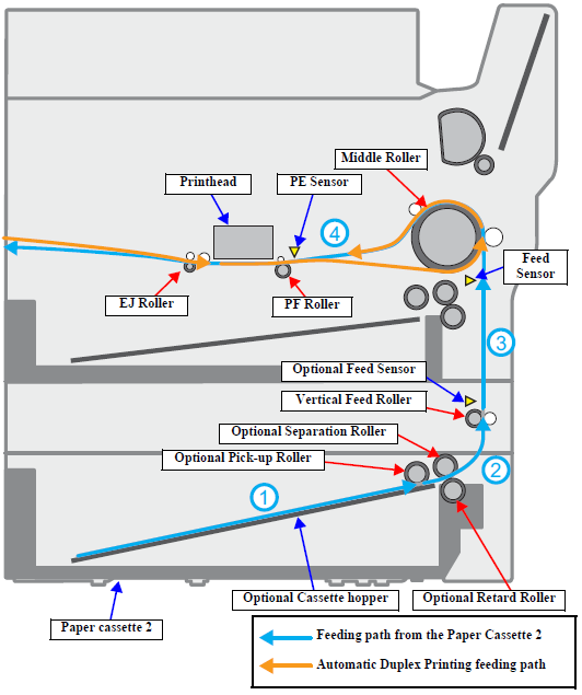 - The paper conveyed to the Middle Roller is conveyed by the Middle Roller to the position where paper is detected by the PE Sensor, and printing is performed in the same way as the Front Cassette.