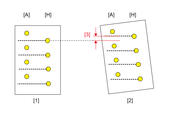 In this adjustment, the inclination of the Printhead is defined as the amount (3) of misalignment of the nozzles (B) on row H and the center points of the spaces between the nozzles (A) on row A shown below. The purpose of the adjustment is to eliminate the misalignment (the inclination of the Printhead) completely.