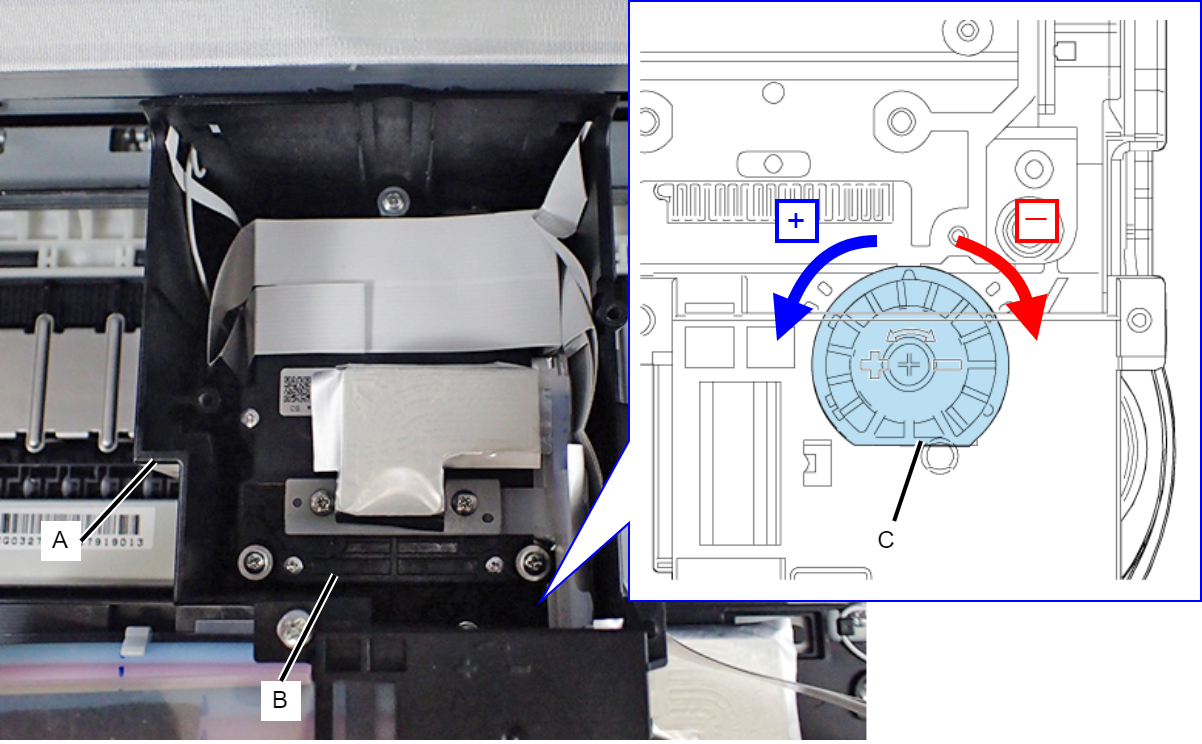 By rotating the head angular adjustment dial (C) on the CR unit (A), the Printhead (B) is rotated on the pivot point on the bottom.