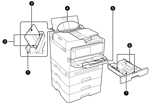 2 | ADF edge guides | Feeds originals straight into the printer. Slide to the edges of the originals. |