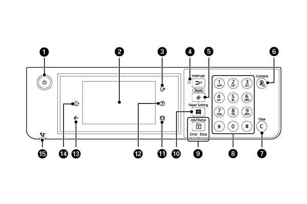 9 | Displays the Job/Status menu. You can check the printer's status and job history. The error light on the left flashes or turns on when an error occurs. The data light on the right flashes when the printer is processing data. It turns on when there are queued jobs. |