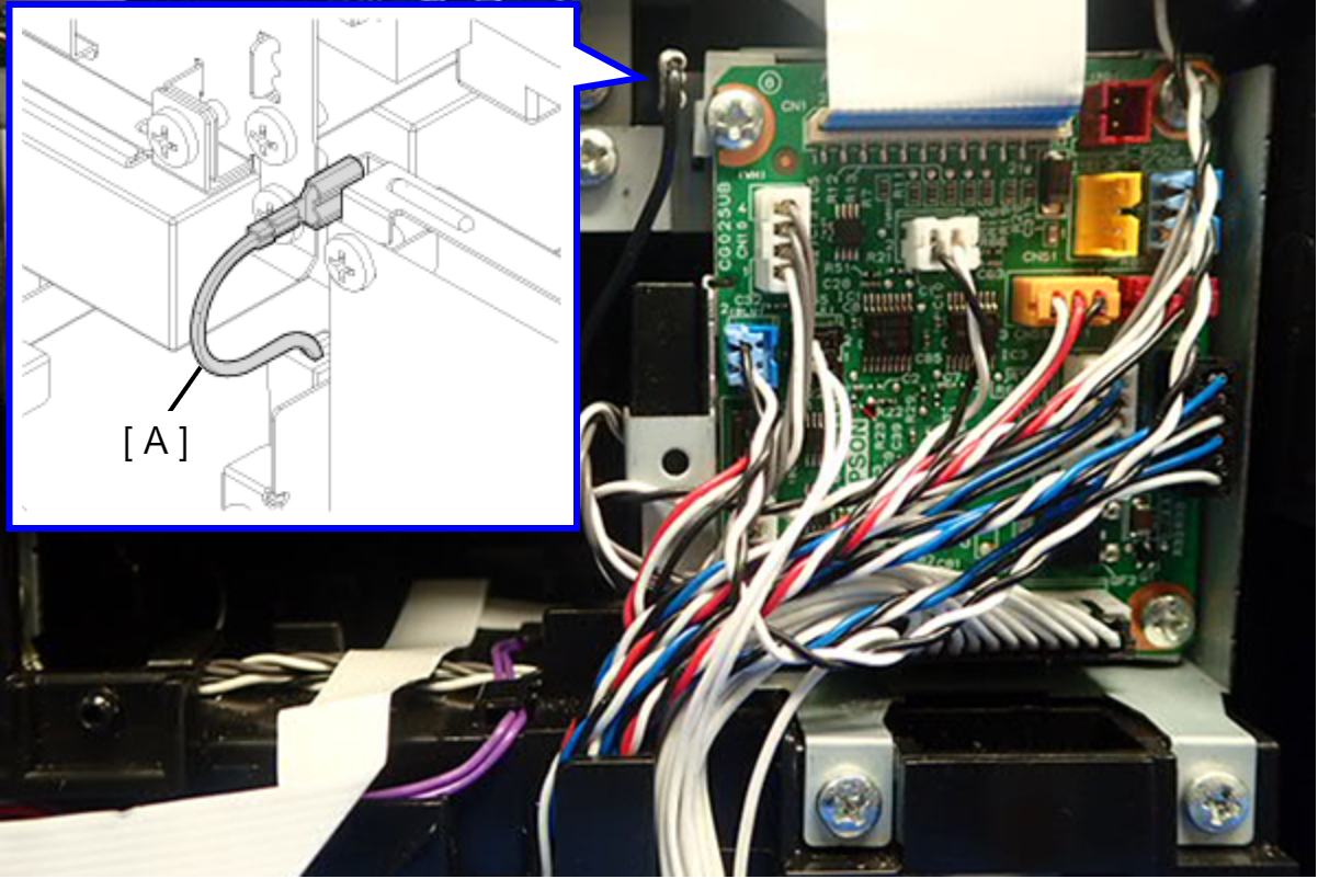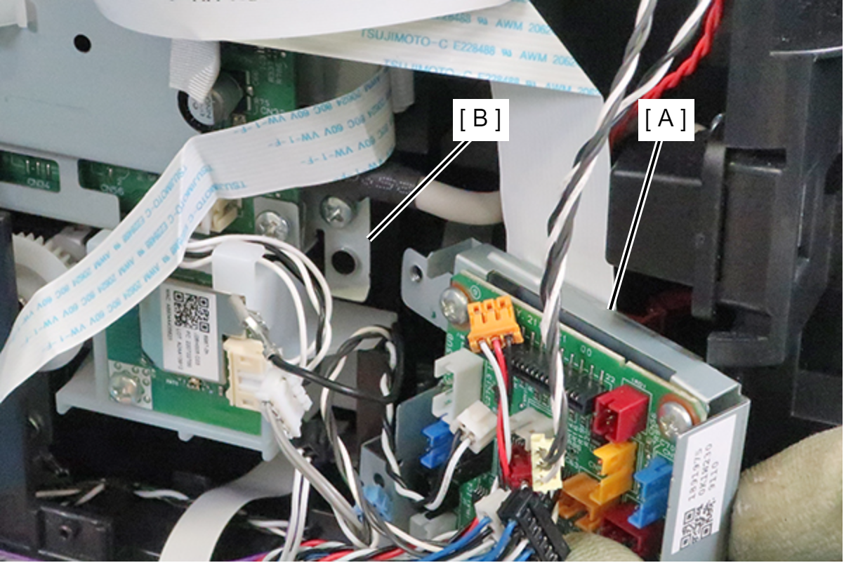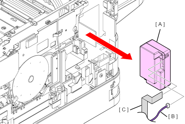 - Disconnect the cable (B) and FFC (C) from the connectors of the Outlinger Board (A), and remove the Outlinger Board (A) in the direction of the arrow.